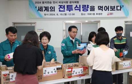 [뉴스서울] 대전 동구는 2024 을지연습 첫날인 20일 동구청 후생관에서 공무원, 유관기관 관계자 등 500여 명이 참여한 가운데 전시 대비 세계 전투식량 전시 및 체험 ’세계 전투식량을 먹어보다‘를 진행했다고 밝혔다.