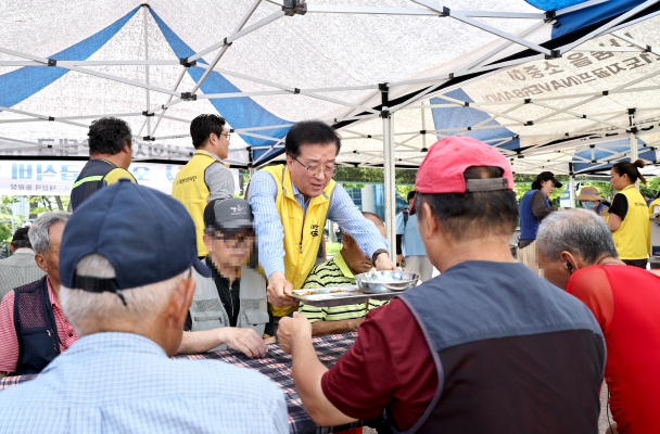 [뉴스서울] 대전시의회 조원휘 의장은 28일 대전역 동광장 일원에서 개최된 대전곰두리 자원봉사연합 주관 ‘나눔과 희망의 밥차’행사에 정명국 행정자치위원장과 참석해 자원봉사자들을 격려하는 가운데, 노숙인 등 300여명의 소외계층을 대상으로 삼계탕 급식봉사를 실천했다.