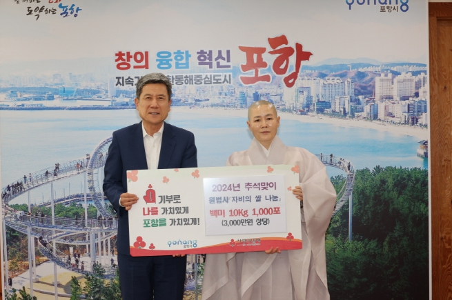 이강덕 시장은 “매년 명절마다 이웃을 위해 자비를 베풀며 나눔을 이어가는 원법사에 깊이 감사드린다”며, “원법사의 이웃을 위한 따뜻한 마음을 잘 전달하겠다”고 말했다.