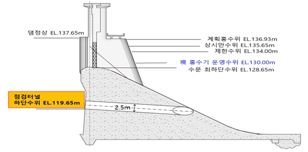 괴산댐 월류 방지 대책은 홍수기 133m인 제한 수위를 130m로 3m하향 운영하고, 호우특보 시에는 128.65m로 운영 수위를 조정한다. 여기에 119.65m 지점에 있는 점검 터널을 개방할 경우 운영 수위를 더 낮출 수 있어 홍수조절용량을 추가 확보할 수 있다.