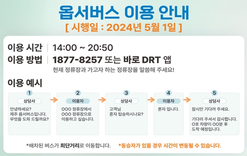 [뉴스서울] 제주특별자치도는 지난해 10월부터 제주시 애월읍 수산리와 서귀포시 남원읍 태흥리 권역에 시범 도입해 운행 중인 수요응답형(DRT) ‘옵서버스’의 운영을 개선해 5월 1일부터 적용한다.