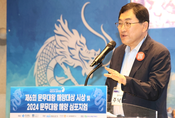 ▲ 주낙영 경주시장이 지난 26일 문무대왕 해양심포지엄에 참석해 인사말씀을 하고 있다. |