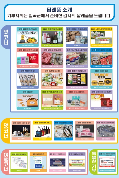 올해 추가 구성된 답례품은 △생표고버섯 및 표고선물세트 △두부선물세트 △씨드워시 세탁세제 △칠곡양떼목장이용권 △타월, 노리개 및 기부링 △감식초화이바 및 홍삼진액 △저출생 극복 성금 기탁 등 6업체 11종이다.