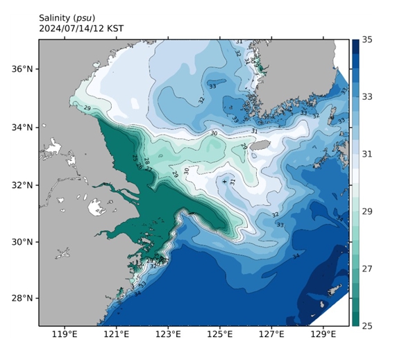 중국 남부지방의 집중호우로 인해 양자강 하구 유출량은 지속적으로 증가하고 있어, 해류나 바람에 의해 저염분수가 제주 연안으로 유입될 가능성이 있는 상황이다.