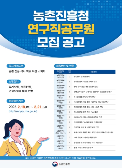 이번에는 디지털 육종, 스마트 농업, 미생물 활용 연구 등 전문가 채용에 중점을 두고 생명유전, 농공, 원예 등 8개 직류에서 총 20명을 선발한다. 18세 이상(2007년 12월 31일 이전 출생) 관련 전공 석사 학위 이상 소지자면 누구나 응시할 수 있다.