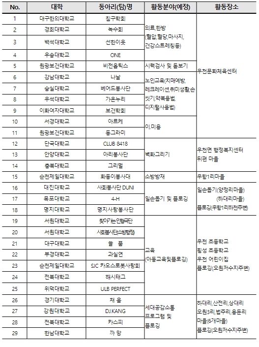 올해는 대학생 봉사단체 200여 명이 참여하며, 7월 1일(월) 발대식을 시작으로 의료활동(한방), 물리치료, 마을 벽화 그리기, 머리 손질, 안경(돋보기) 맞추기, 소방 안전 점검, 아동교육 프로그램, 농촌 일손돕기 등 다양한 활동을 전개할 예정이다.