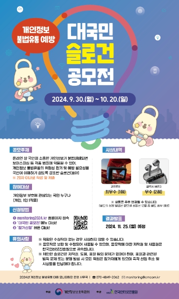 ‘개인정보 불법유통 예방 슬로건 공모전’은 9월 30일부터 10월 20일까지 개인정보 보호에 관심이 있는 국민 누구나 참여할 수 있다. 개인정보 불법유통의 위험성과 예방 필요성에 대해 국민이 이해하기 쉬운 20자 이내의 슬로건을 제출하면, 당선된 작품은 개인정보 불법유통 대응을 위한 홍보에 활용될 예정이다.