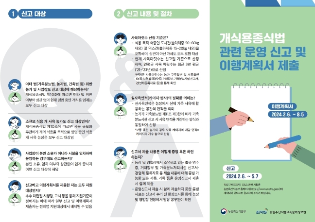 개의 식용을 목적으로 현재 운영 중인 개 사육 농장주 및 개식용 도축·유통상인, 개식용 식품접객업자는 5월 7일까지 증빙자료와 함께 신고서를, 8월 5일까지 폐업 이행계획서를 본인이 직접 작성·제출해야 한다.