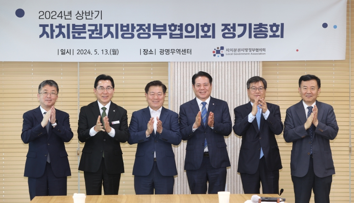 | ▲ 자치분권지방정부협의회는 13일 광명무역센터에서 2024년 상반기 정기총회를 열었다(사진 왼쪽부터 장상길 포항부시장 박경귀 아산시장 박승원 광명시장 최대호 안양시장 신종우 은평구 부구청장 우정욱 자치분권지방정부협의회 사무총장) |