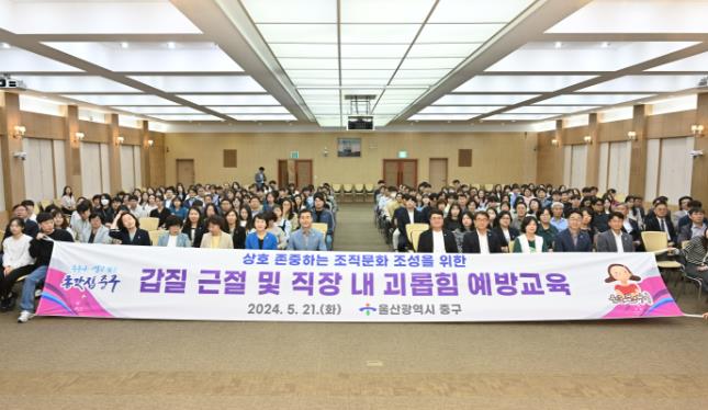 [뉴스서울] 울산 중구가 5월 21일 오후 3시 중구청 대회의실에서 간부 공무원과 신규 임용자, 승진자 등 직원 250여 명을 대상으로 갑질 근절 및 직장 내 괴롭힘 예방교육을 실시했다.