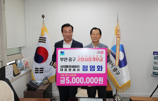 [뉴스서울] 부산 중구는 지난 1일 구청장실에서 정영화 신대동관세법인 대표관세사와 고향사랑기부금 전달식을 가졌다.
