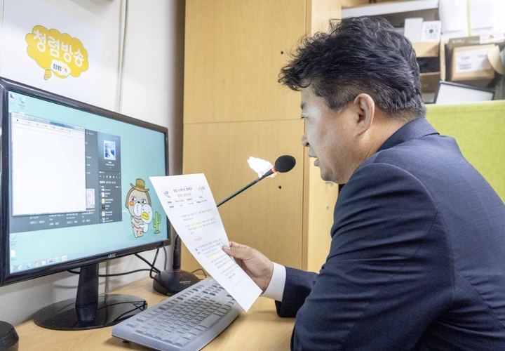 ▲ 최충규 대덕구청장이 28일 ‘청렴 방송 릴레이 행사’ 첫 주자로 나서서 청렴 방송을 진행하고 있다. |