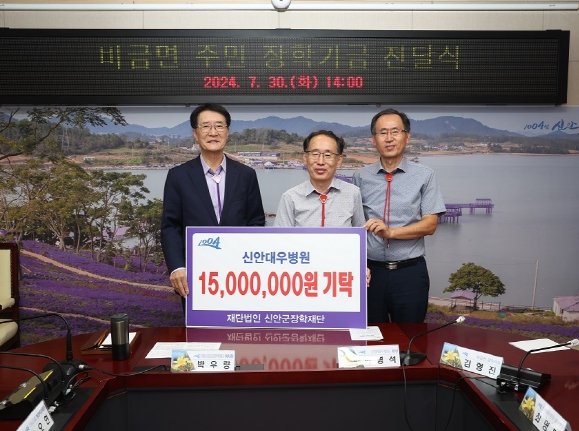 [뉴스서울] 신안대우병원 최명석 원장과 직원들은 지난 7월 30일 신안군청을 방문해 (재)신안군장학재단에 장학기금 1,500만 원 기탁을 약정하고 300만 원을 전달했다.