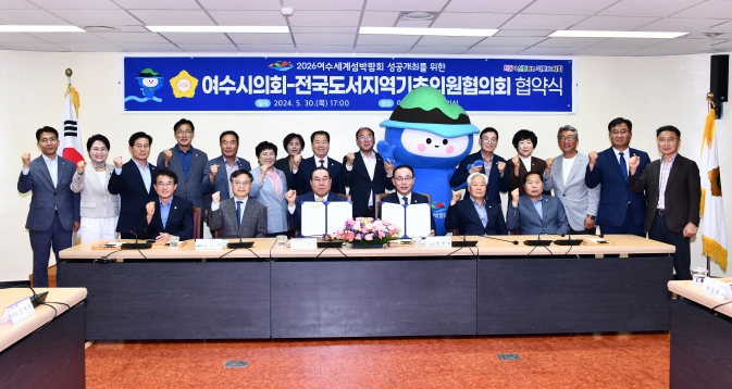 [뉴스서울] 여수시의회는 5월 30일 소회의실에서 전국도서지역기초의원협의회와 2026여수세계섬박람회 성공개최를 위한 협약식을 열었다.