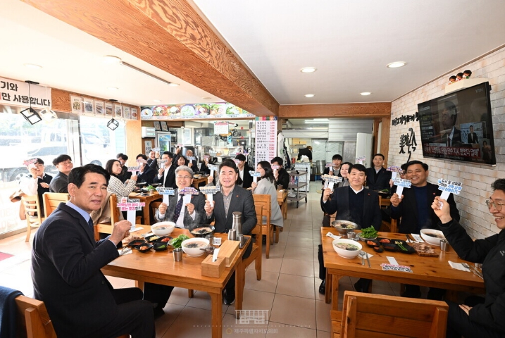 ▲ 제주특별자치도의회 이상봉 의장, 임정은 의회운영위원장, 박호형 행정자치위원장, 강동원 의회사무처장, 고경대 총무담당관 및 직원들은 2025년 2월 11일(화) 12시 국수문화거리 미미식당에서 점심 국수 간담회를 개최하여 지역상생, 민생경제를 살리는 우리동네 소비실천운동을 전개했다. |