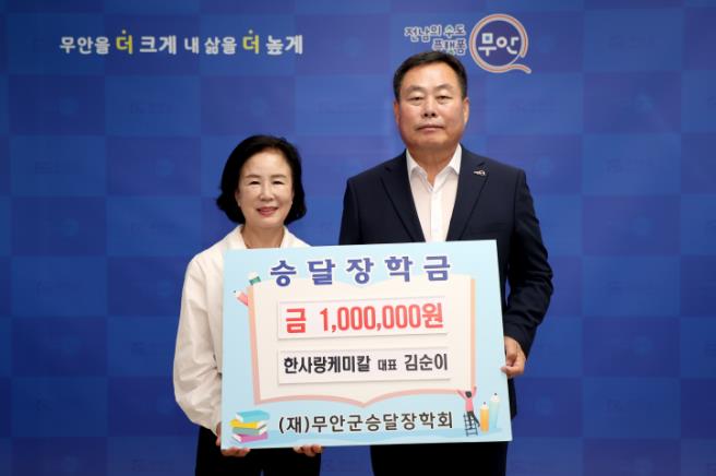 [뉴스서울] 전남 무안군은 5일 한사랑케미칼 김순이 대표가 지역인재 양성을 위해 소중히 써달라며 장학금 100만 원을 (재)무안군승달장학회에 기탁했다고 밝혔다.