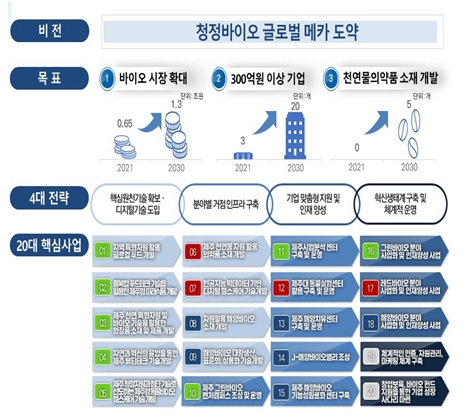 분야별 주요사업으로는 ▲(그린) 지역특화자원 활용 푸드·화장품 개발, 동물바이오 헬스케어 기술개발, 벤처캠퍼스 조성 ▲(레드) 천연물 활용 의약품 소재개발, 디지털 헬스케어, 동물실험센터 구축 ▲(해양) 해양바이오 소재개발 및 대량생산 기술 개발, 해양치유센터 구축 등이다.