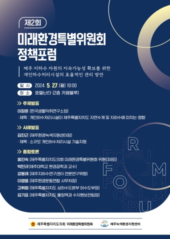 이번 포럼 주제는 '제주 지하수 자원의 지속가능성 확보를 위한 개인하수처리시설의 효율적인 관리 방안'으로, 제주에서 꾸준히 증가하고 있는 개인하수처리시설의 관리 현황과 문제점 등을 파악하고, 효율적인 개인하수처리시설의 운영 및 관리방안 논의를 통해서 지하수 오염 예방과 지하수 자원의 지속가능한 해법을 찾고자 기획됐다.