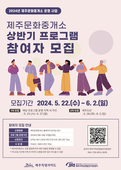 [뉴스서울] 제주특별자치도는 도민 누구나 도내 어디서든 문화여가 프로그램을 즐길 수 있도록 마련한 ‘제주문화중개소’ 사업의 2024년 상반기 프로그램 참가자를 22일부터 다음달 2일까지 모집한다.