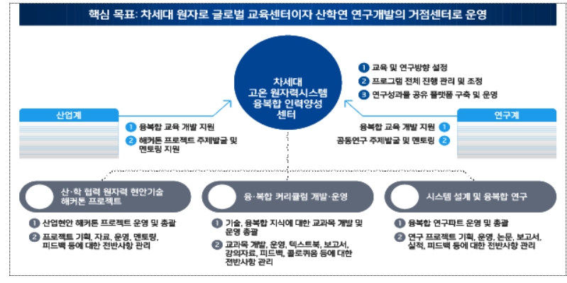 동 센터는 주관 대학을 중심으로 기업 수요를 반영한 문제해결 프로그램을 운영하고 정부 출연 또는 기업 연구기관에서 진행 중인 미래 원자력 시스템 설계에 참여하는 등의 다양한 산 ․ 학 ․ 연 협력 프로젝트를 추진한다.