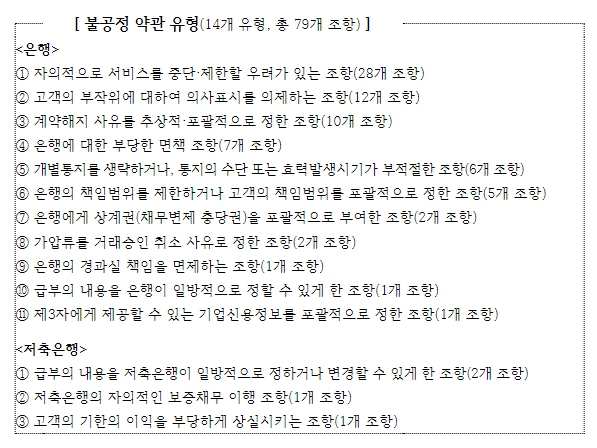공정위는 매년 은행·저축은행, 여신전문금융회사 및 금융투자업자 등 금융기관에서 새롭게 제·개정되는 금융거래 약관에 대한 심사를 진행해오고 있으며, 금융거래 고객의 권익을 보다 신속하게 보호하기 위하여 먼저 심사가 완료된 은행·저축은행 분야부터 불공정 약관 시정을 요청했다.
