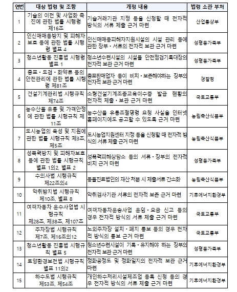 그동안 '민원 처리에 관한 법률' 등에 따라 전자적 방식으로 각종 서류를 제출ㆍ보관할 수 있음에도, 국민들이 이러한 규정을 알지 못해 서류를 실물로 제출ㆍ보관하는 경우가 있었다. 이와 같은 국민 불편을 해소하기 위해 서류의 제출ㆍ보관 의무를 규정하고 있는 '기술의 이전 및 사업화 촉진에 관한 법률 시행령' 등 4개 대통령령에 직접 전자적 방법으로 서류를 제출ㆍ보관할 수 있도록 하는 근거를 마련했고, '건설기계관리법 시행규칙' 등 11개 부령에도 동일한 근거를 마련하여 3월 24일 공포될 예정이다.