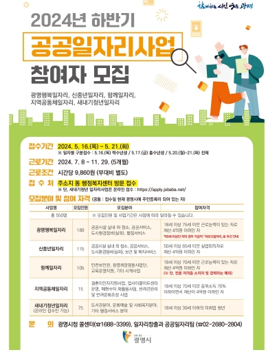 2024년 하반기 공공일자리사업은 ▲광명 행복일자리 ▲신중년일자리 ▲함께일자리 ▲지역공동체일자리 ▲새내기청년일자리 등 총 5개 사업이며 저소득 취업 취약계층, 실직자, 미취업 청년 등이 모집 대상이다.