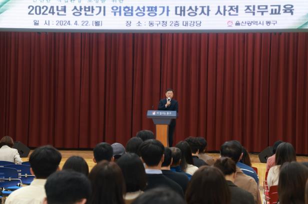 [뉴스서울] 울산 동구는 4월 22일 오전 10시 동구청 2층 대강당에서 위험성평가 담당자 및 근로자 대표, 도급용역위탁사업자 등 360여명을 대상으로 위험성평가 사전 직무교육을 실시하였다.