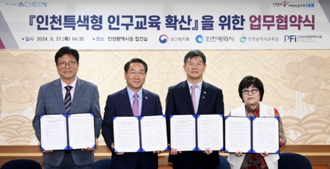 [뉴스서울] 인천광역시는 6월 27일 시청 접견실에서 보건복지부, 인천시교육청, 인구와미래정책연구원과 ‘인천특색형 인구교육 확산 업무협약’을 체결했다고 밝혔다.