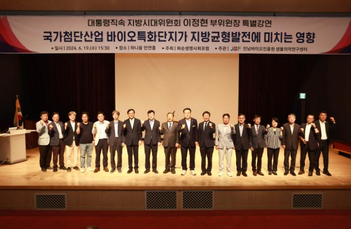 이정현 지방시대위원회 부위원장은 이날 강연에서 “새로운 지방시대에 발맞춰 화순이 나아가야 할 역할과 선제적 대응 전략”을 제시했으며, 특히 ‘전남(화순군)이 산업통상자원부에 공모 신청한 국가첨단전략산업 바이오 특화단지가 지방균형발전에 미치는 영향’에 대한 설명과 함께 참석자와 질의응답의 시간을 가졌다.