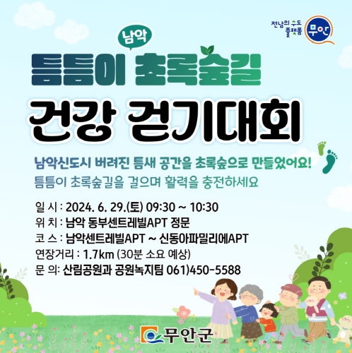 [뉴스서울] 전남 무안군은 6월 29일 오전 9시 30분 남악 동부센트레빌 아파트 정문에서 출발하는 ‘남악 틈틈이 초록숲길 건강 걷기대회’를 개최한다.