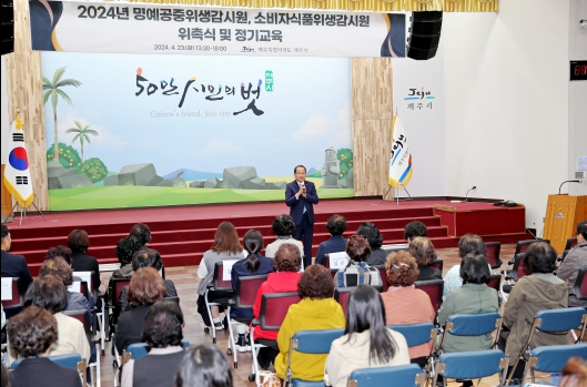 [뉴스서울] 강병삼 제주시장은 4월 23일 시청 제1별관 회의실에서 열린 『2024년 명예공중 및 소비자식품 위생감시원 위촉식』에 참석해 민간 위생감시원들에게 위촉장을 수여하고, 응원의 말을 전했다.