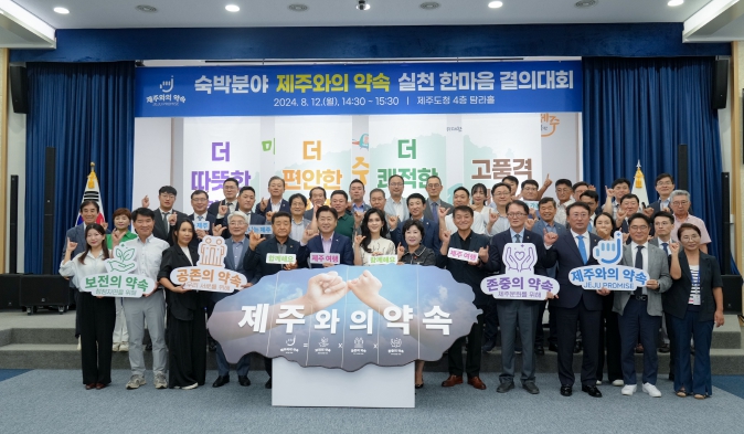 제주도는 12일 오후 2시 30분 제주도청 탐라홀에서 ‘제주와의 약속 ’숙박분야 실천 결의대회를 개최하고, 보다 쾌적하고 안전한 숙박환경 조성과 경쟁력 강화 방안을 집중 논의했다.