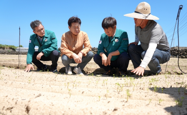 오영훈 제주도지사는 12일 오전 구좌읍 당근 농지 가뭄현장을 방문해 상황을 점검하고 즉각적인 지원방안을 모색했다.