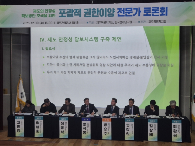 [뉴스서울] 제주특별자치도가 포괄적 권한이양 제도의 실효성과 안정성 확보를 위해 전문가 토론회를 개최한 가운데, 전문가들은 제도의 법적 타당성을 확인하며 공청회 의무화·규제심사 강화 등 안정적 운영 방안을 구체화했다.