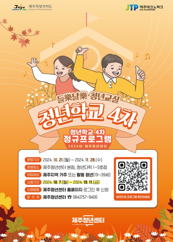 [뉴스서울] 제주특별자치도와 제주청년센터(제주TP 산하)가 10월 7일 부터 10월 11일까지 청년학교 4차 정규프로그램 참여자를 모집한다.