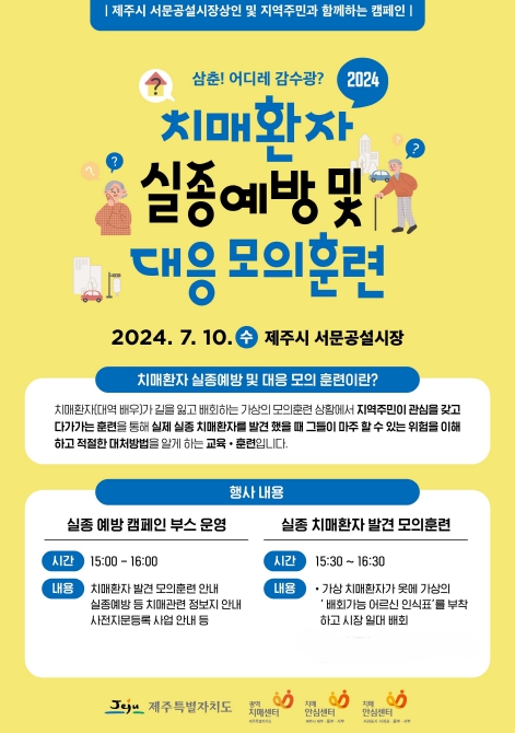 [뉴스서울] 제주특별자치도가 오는 10일 오후 3시부터 제주시 서문공설시장에서 광역치매센터 및 6개소 치매안심센터와 치매환자 실종예방 및 대응 모의훈련을 실시한다.