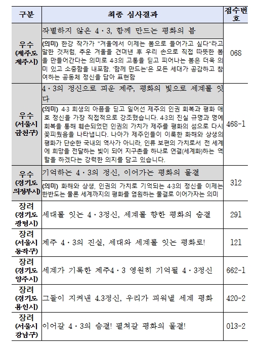 공모를 통해 선정된 우수작은 ‘작별하지 않은 4·3, 함께 만드는 평화의 봄’, ‘4·3의 정신으로 피운 제주, 평화의 빛으로 세계를 잇다’, ‘기억하는 4·3의 정신, 이어가는 평화의 물결’ 등 3편이다.