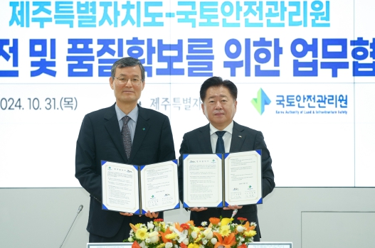 이날 협약식에는 오영훈 제주도지사와 김일환 국토안전관리원장이 참석해 업무협약서에 서명하고, 지역사회 주요 현안 사업 추진 시 안전관리 역량 강화를 위한 상호 협력방안을 논의했다.
