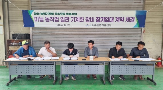 [뉴스서울] 제주특별자치도 농업기술원 서부농업기술센터는 25일 마늘 주산지 5개 농협 및 작목반(대정농협, 고산농협, 안덕마늘기계화작목반, 신도2리마늘작목반, 신도3리푸른작목반)과 ‘마늘 농업기계화 우수모델 육성사업’의 일환으로 농업기계 장기임대 계약을 체결했다.