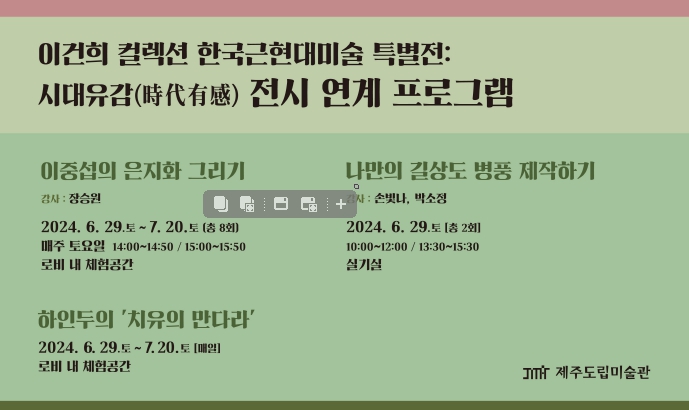 [뉴스서울] 제주도립미술관은 ‘이건희컬렉션 한국 근현대미술 특별전 《시대유감(時代有感)》 연계 체험프로그램’을 6월 29일부터 7월 20일까지 운영한다.