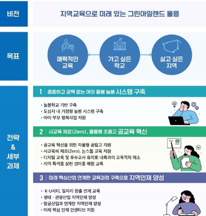 울릉형 교육발전특구 사업에는 ▲촘촘하고 공백 없는 아이 돌봄·늘봄 시스템 구축 ▲사교육 제로(Zero), 울릉형 초중고 공교육 혁신 ▲미래 핵심산업 연계한 교육과정 구축으로 지역인재 양성 등의 모델이 담겨 있다.