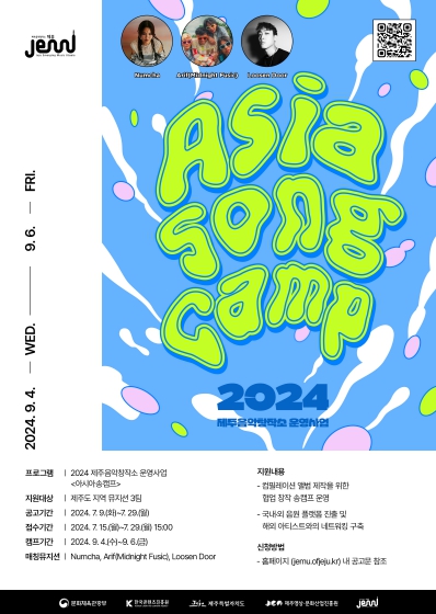 이번 아시아송캠프에 참여하는 아세안 뮤지션으로는 Numcha(태국), Arif(Midnight Fusic, 말레이시아), Loosen Door(국내)이며, 도내 뮤지션 선발 완료일로부터 8월 말까지 사전 협력 기간을 거친 뒤, 9월 4일에서 6일까지 2박 3일간 제주음악창작소 및 제주 일대에서 창작 송캠프를 진행할 예정이다.