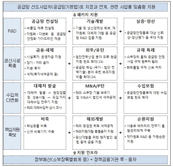 산업부는 이들 프로젝트의 공급망 안정화를 관계부처·기관 등과 협업하여 적극 검토/추진하기로 하였다. 먼저, 기술개발, 생산투자, 대체처, 비축 등 공급망 종합 지원사업 메뉴판을 마련하고 맞춤형으로 패키지 지원한다. 국내 생산시설 확충을 위한 재정·금융·세제 등 추가 지원방안도 검토한다. 또한, 수급 위험이 큰 품목은 연간 수급관리계획을 수립해 공공비축 확대, 민간 재고 확보 등을 선제적으로 추진하다. 아울러, 프로젝트별로 업계-지원기관 등으로 민관 합동 공급망 얼라이언스를 구성해 공급망 안정화 과제 및 애로를 상시 발굴하고, 금융, 무역, R&D, 핵심광물 등 관계기관으로 공급망 지원기관 협의체를 운영해 이를 신속히 해결해 나간다.