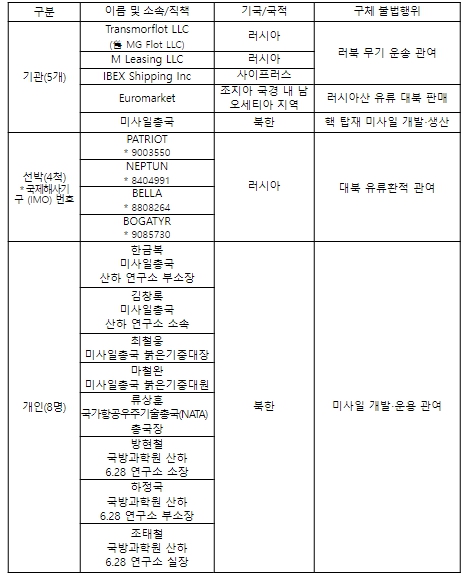패트리어트(PATRIOT)호, 넵튠(NEPTUN)호, 벨라(BELLA)호, 보가티(BOGATYR)호 등 러시아 선박 4척은 유엔 안보리 대북 제재 결의를 위반하여 북한 선박과의 해상환적을 통해 북한에 유류를 공급하는 데 관여해왔으며, 남오세티아 지역에 소재한 Euromarket은 러시아산 정제유를 북한에 판매하는 데 관여했다. 정제유는 북한의 핵·미사일 개발에 필수적인 자원으로, 국제사회는 안보리 대북제재 결의 제2397호를 통해 북한으로 반입되는 유류의 양을 연간 원유 400만 배럴, 정제유 50만 배럴로 제한했고, 결의 제2375호를 통해 북한 선박과의 선박 간 해상환적을 금지하고 있다.