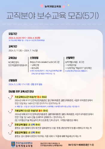 [뉴스서울] 한국기술교육대학교 능력개발교육원은 4월 24일부터 직업능력개발훈련 교·강사의 자질 향상을 위한 5기 보수교육 교육생 1만 4천 명을 모집한다. 한기대는 올해 총 6만 명의 훈련 교·강사 보수교육 교육생 모집을 목표로 하고 있다.