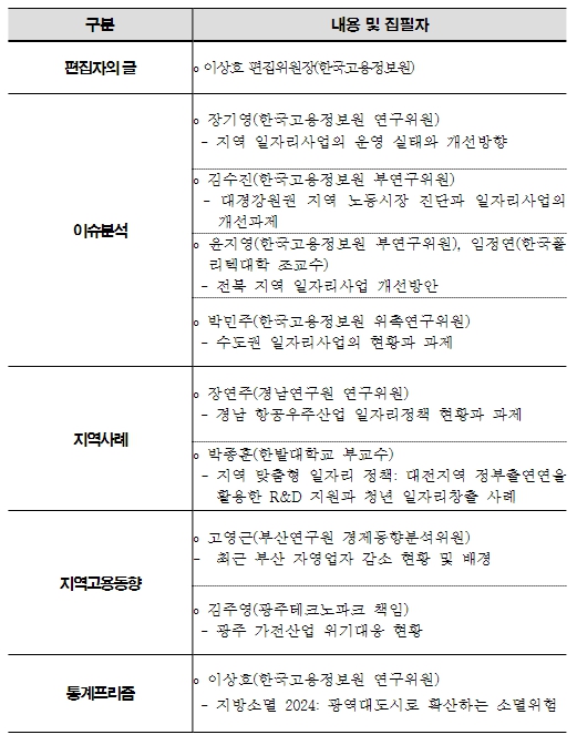 이번 여름호는 ‘지역 산업맞춤형 일자리사업의 성과와 과제’를 기획 주제로 내세워 지역의 일자리 사업과 관련 최근 지역의 고용 이슈를 집중적으로 파헤쳤다. 또한 통계청의 『주민등록인구통계』를 이용해 2024년 3월 기준 소멸위험지역의 현황과 특징도 담았다.