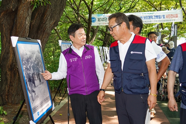 ▲ 전쟁사진을 보며 대화를 나누는 이필형 동대문구청장(사진 왼쪽)과 도진환 한국자유총연맹 동대문구지회장 |