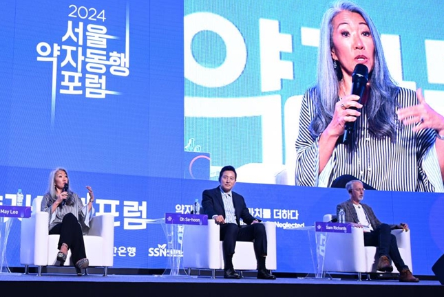 ▲ 27일(목) 오전, DDP 아트홀2관에서 열린 ‘2024 서울 약자동행 포럼’에 참석한 오세훈 서울시장이 특별대담에서 메이 리 대표의 답변을 청취하고 있다.(사진 왼쪽부터 메이 리 로투스 미디어 하우스 대표, 오세훈 시장, 샘 리처드 펜실베니아주립대학교 교수) |