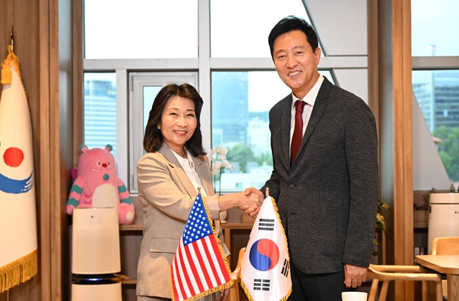 ▲ 오세훈 서울시장이 8월 22일(목) 11시, 시청 집무실에서 실비아 장 루크(Sylvia Jang Luke) 하와이주 부주지사와 면담을 나눈 후 악수하며 기념 촬영하고 있다. (사진 왼쪽부터 실비아 장 루크 하와이주 부주지사, 오세훈 서울시장) |